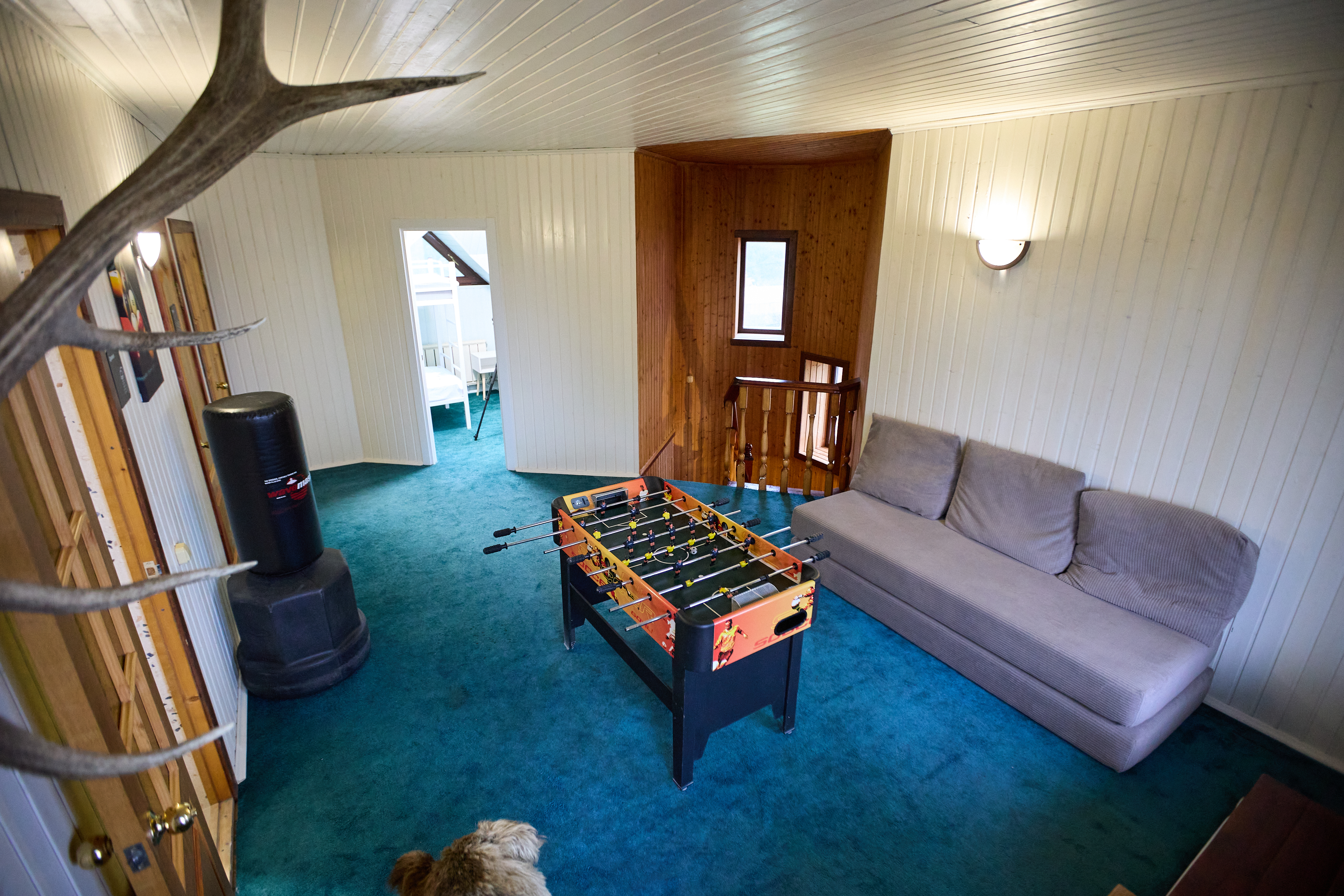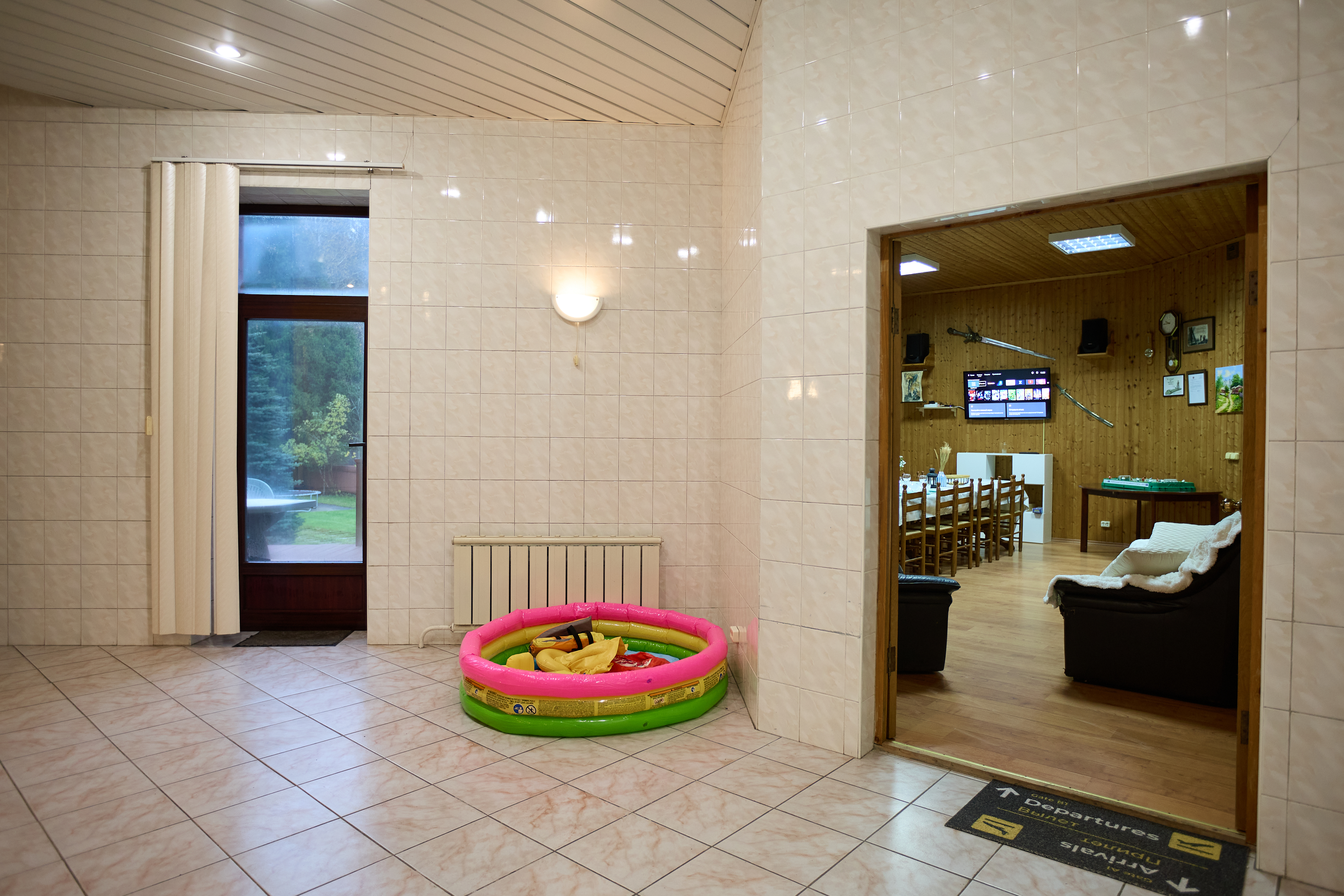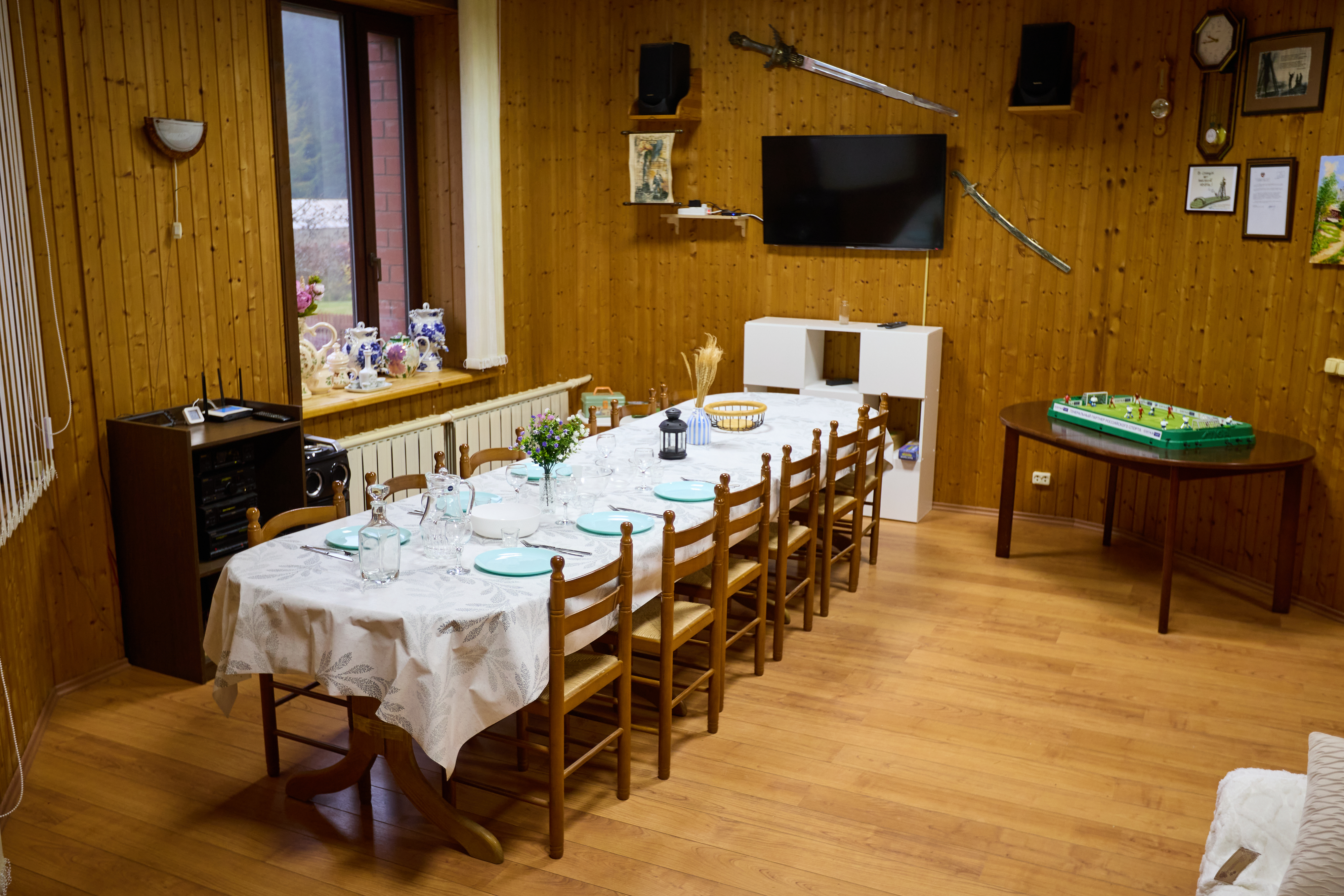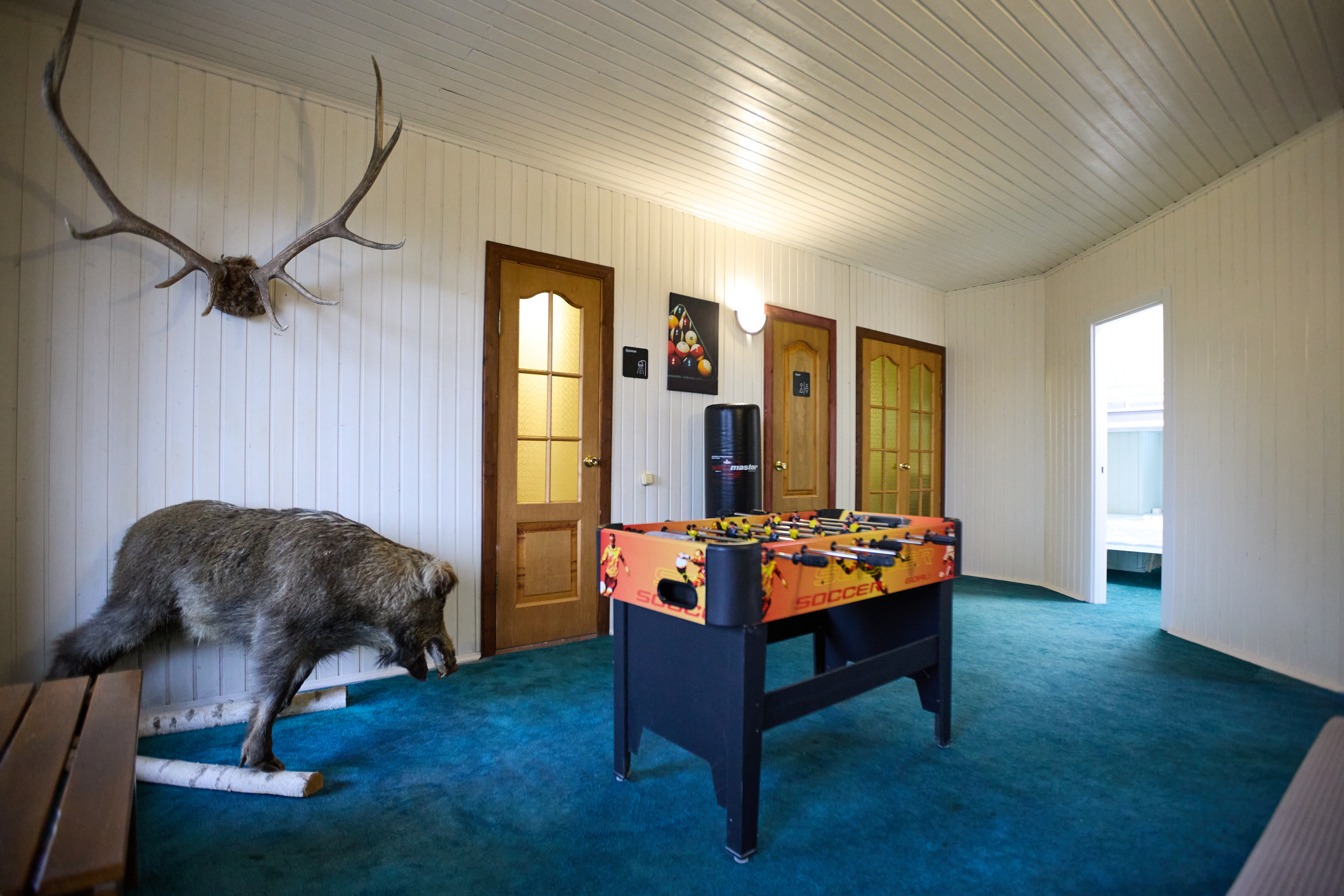 Гостиный зал 120 м² с русским бильярдом, пинг-понгом, настольным футболом, дартсом. В помещении установлен кондиционер. Музыкальный центр. Также имеются 3 раскладных дивана (5 спальных мест).
