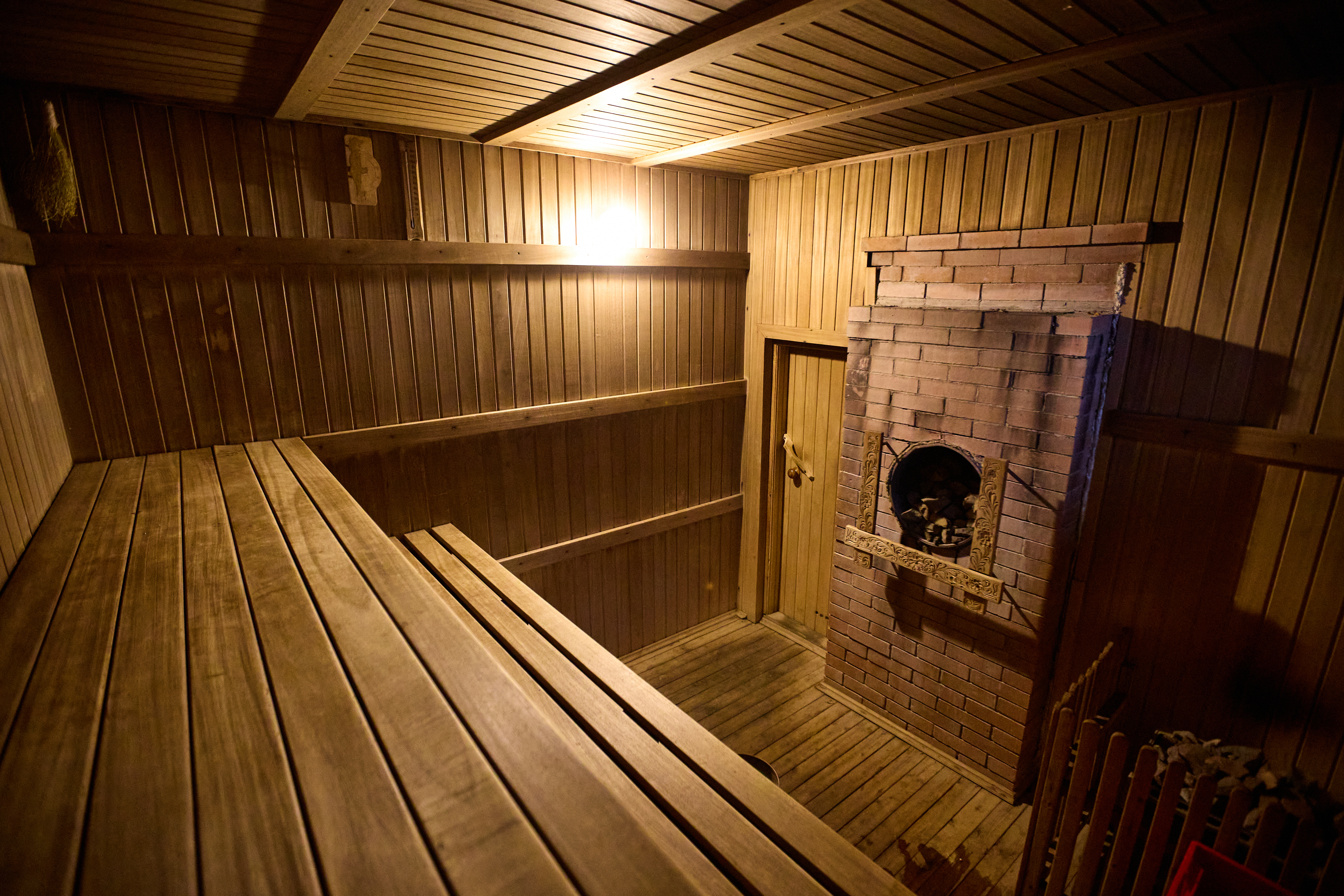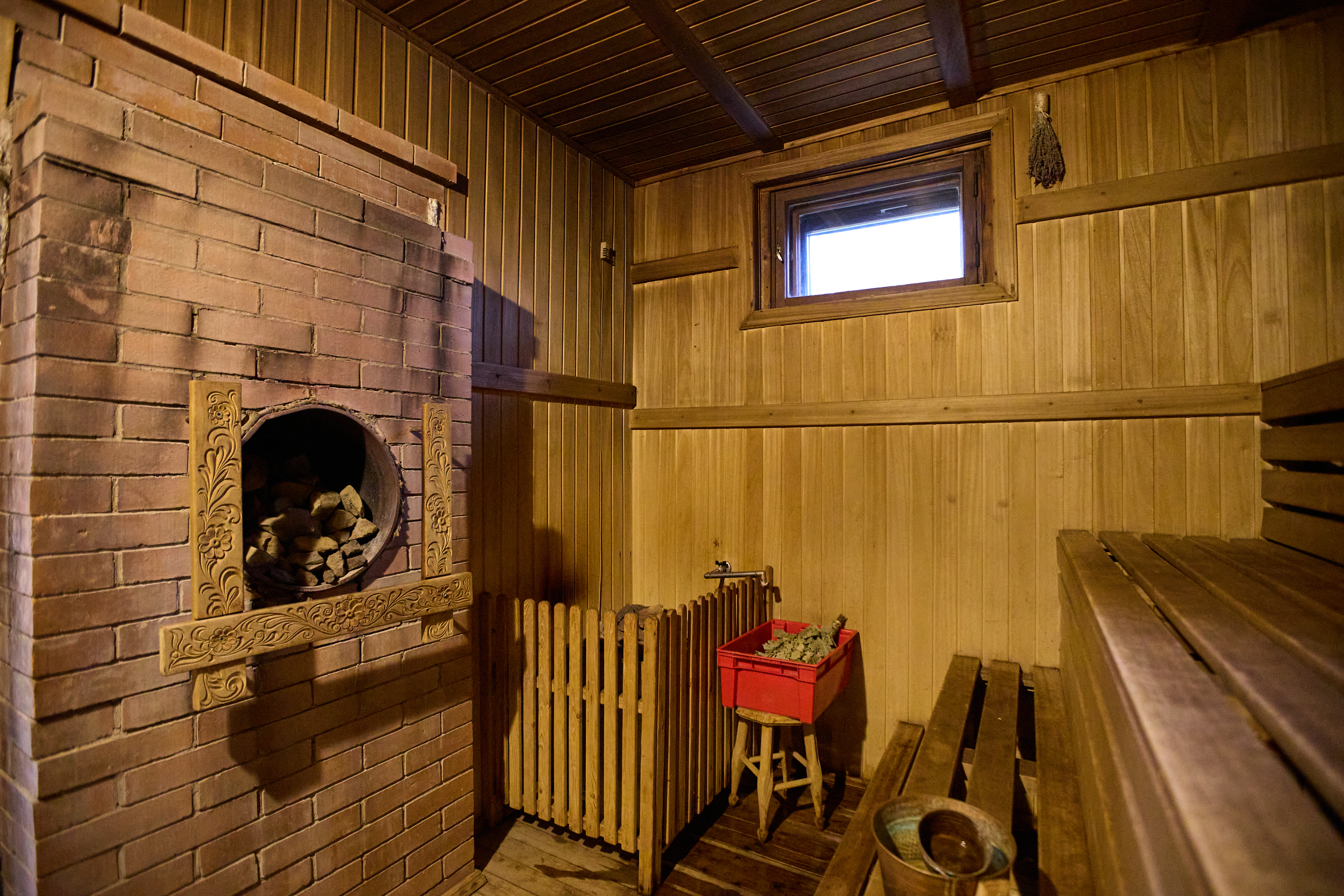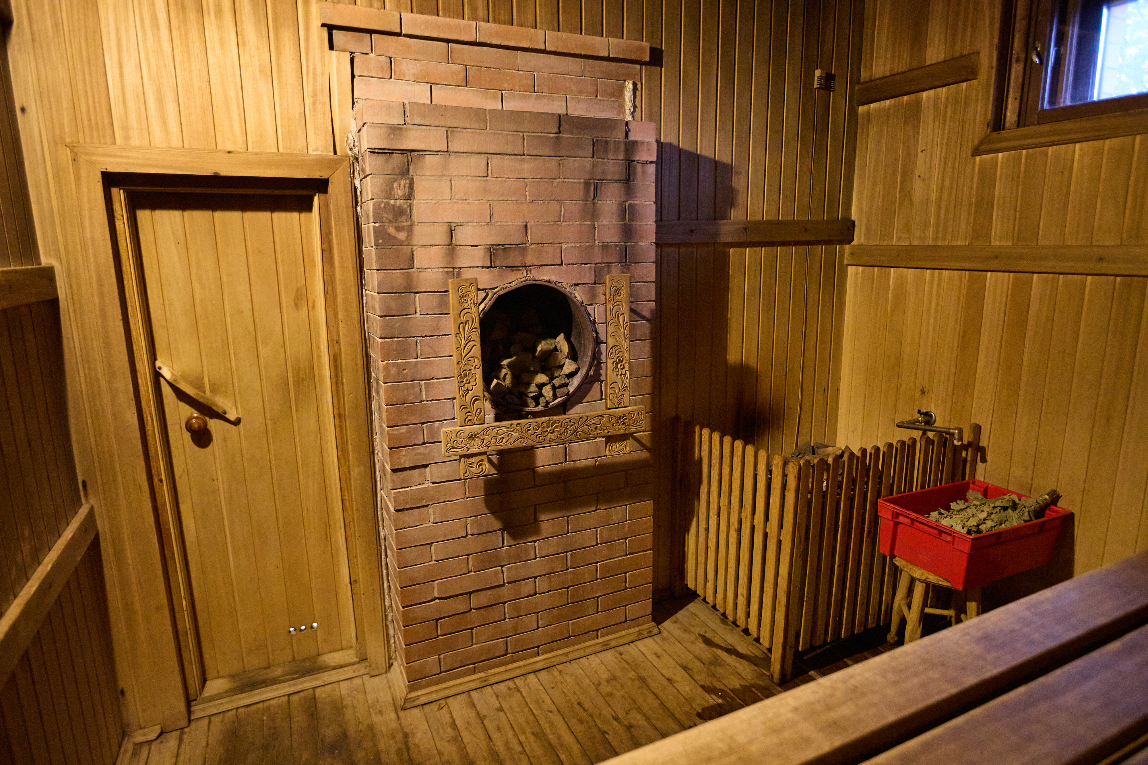 Баня (сауна для температуры и каменная печь для влажности) длительностью 4 часа в сутки. Один березовый или дубовый веник на выбор включен в стоимость. Мы используем качественную химию для очистки сауны после каждого парения.