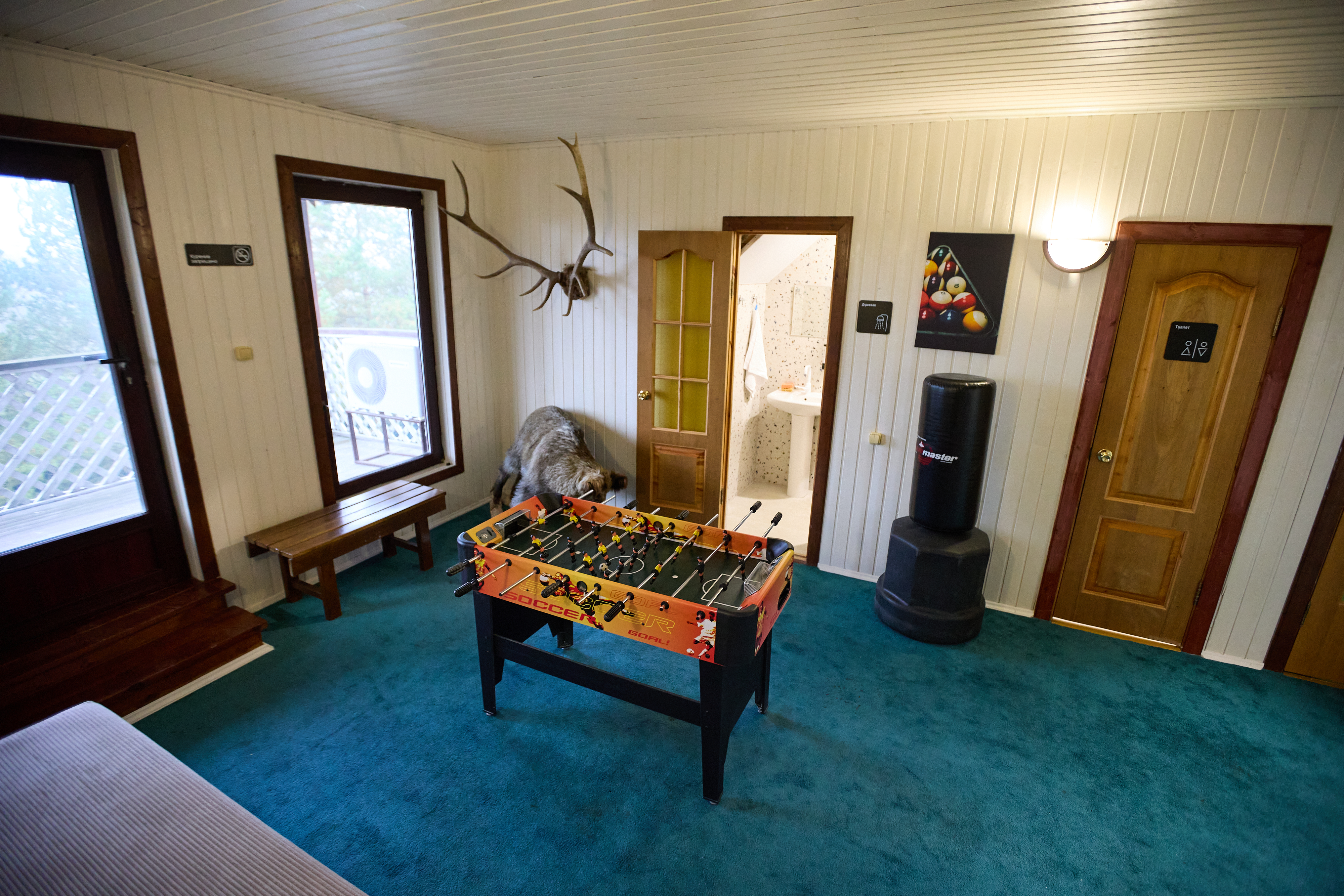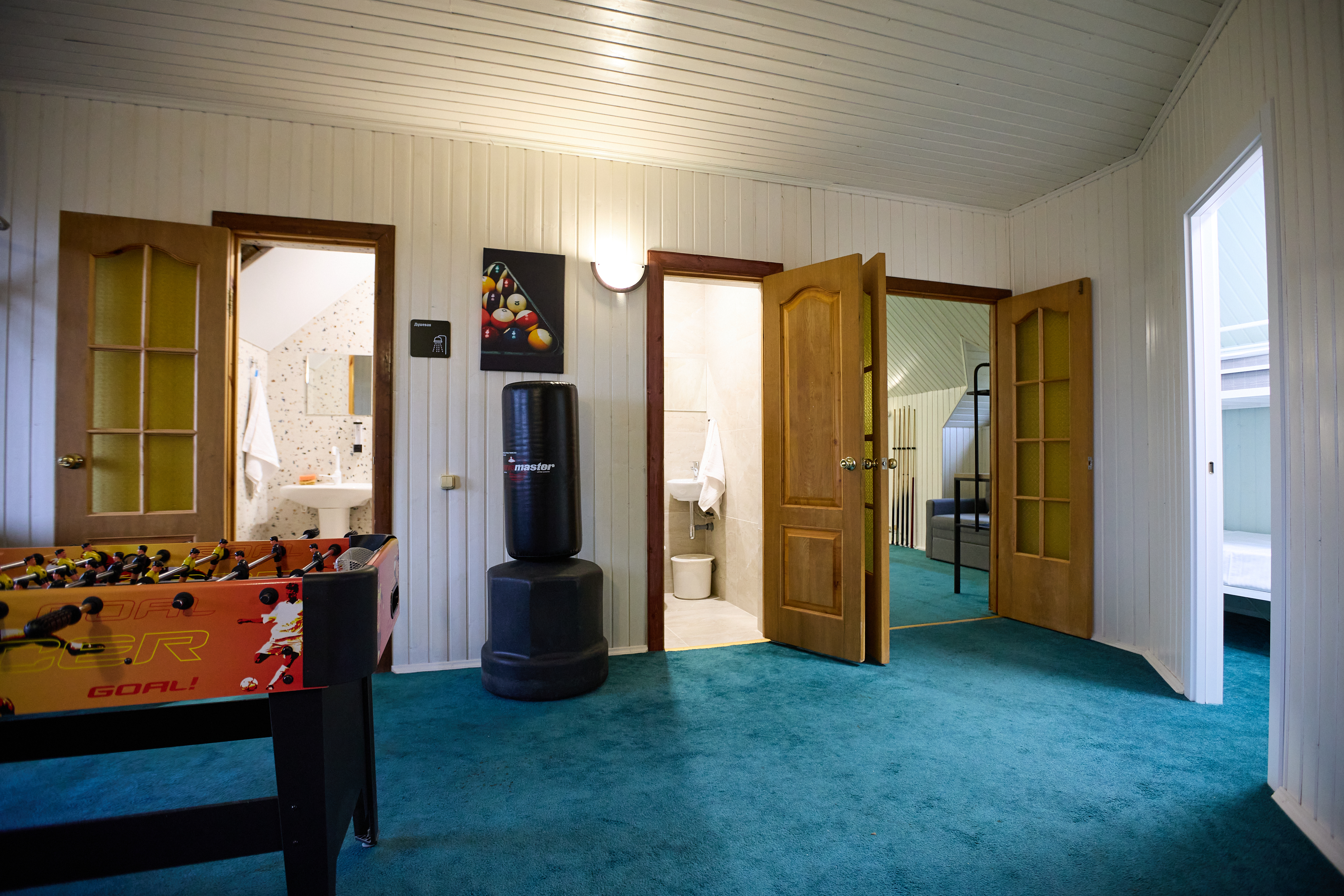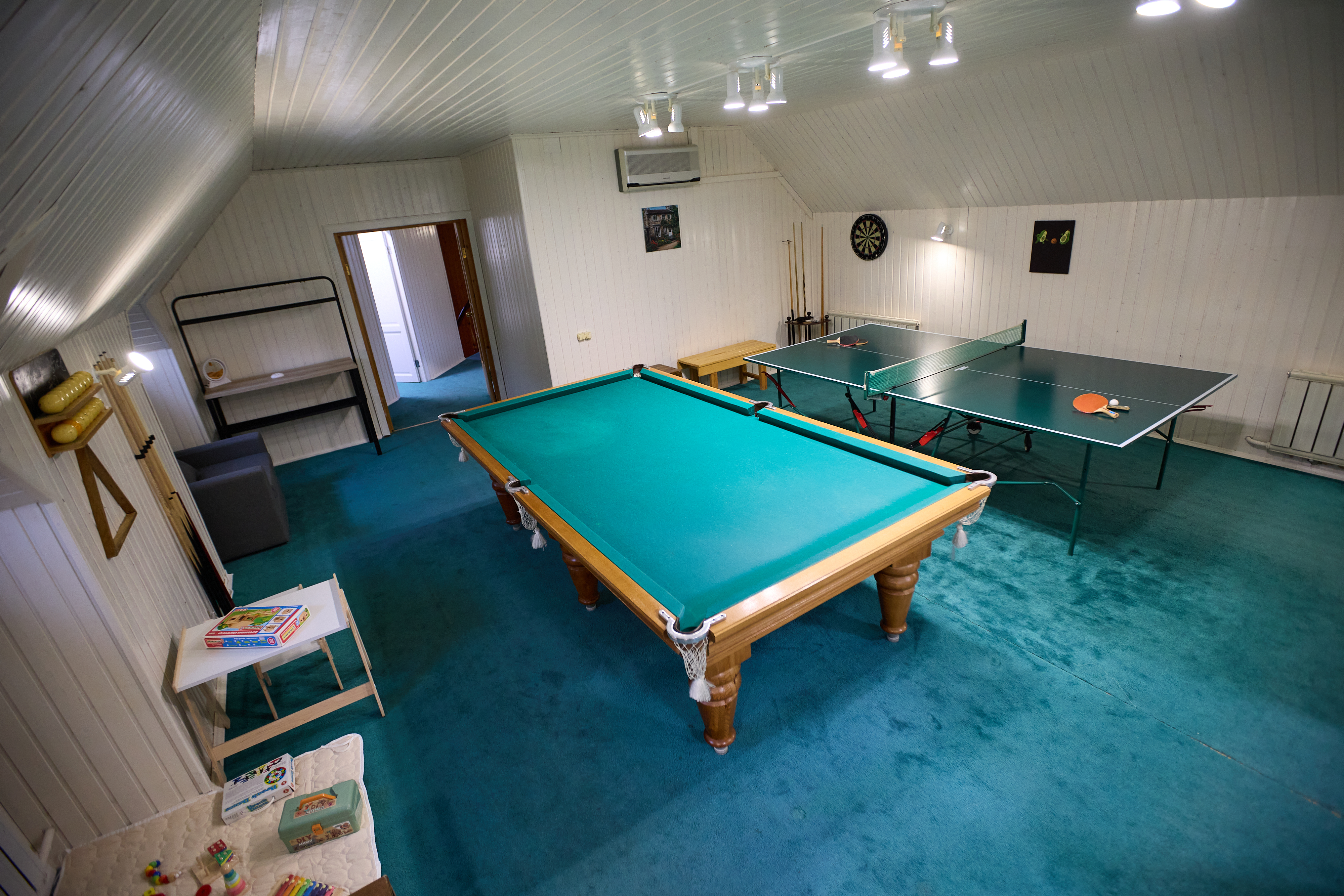Игровая комната с бильярдом, настольным теннисом и футболом, дартс и куча детских игр.