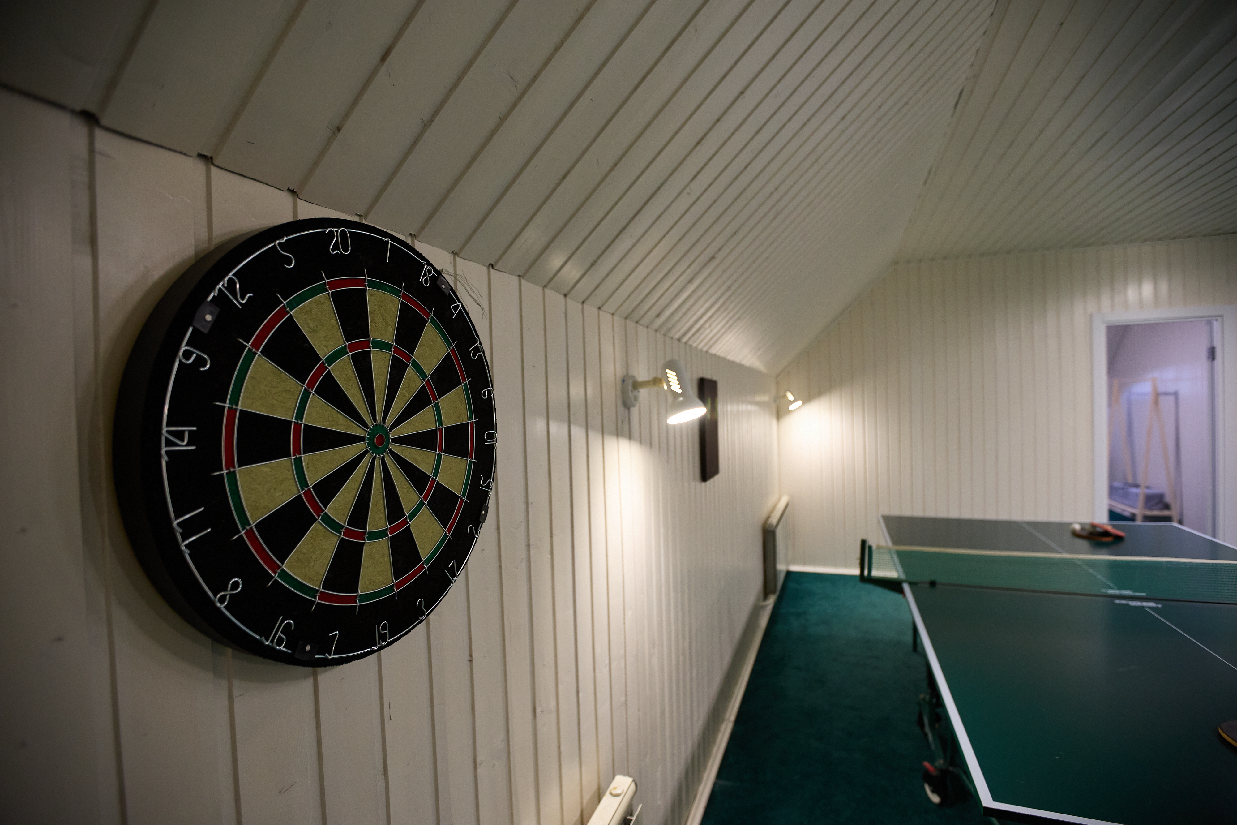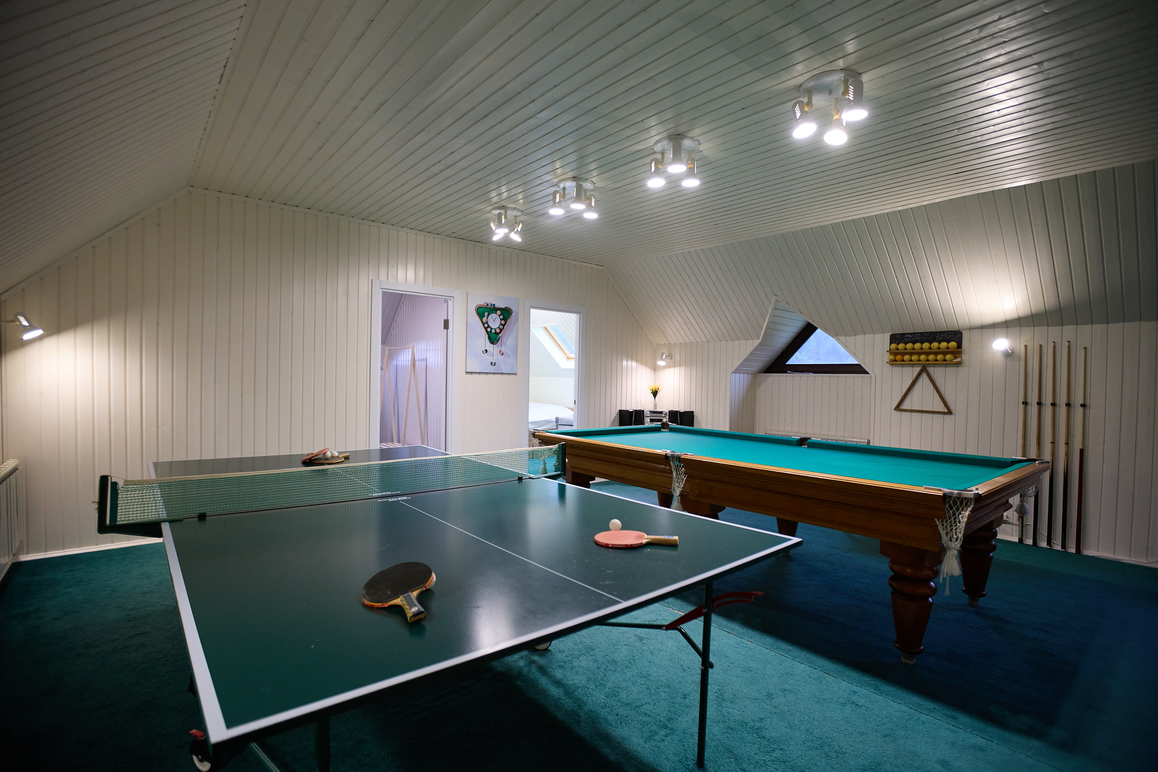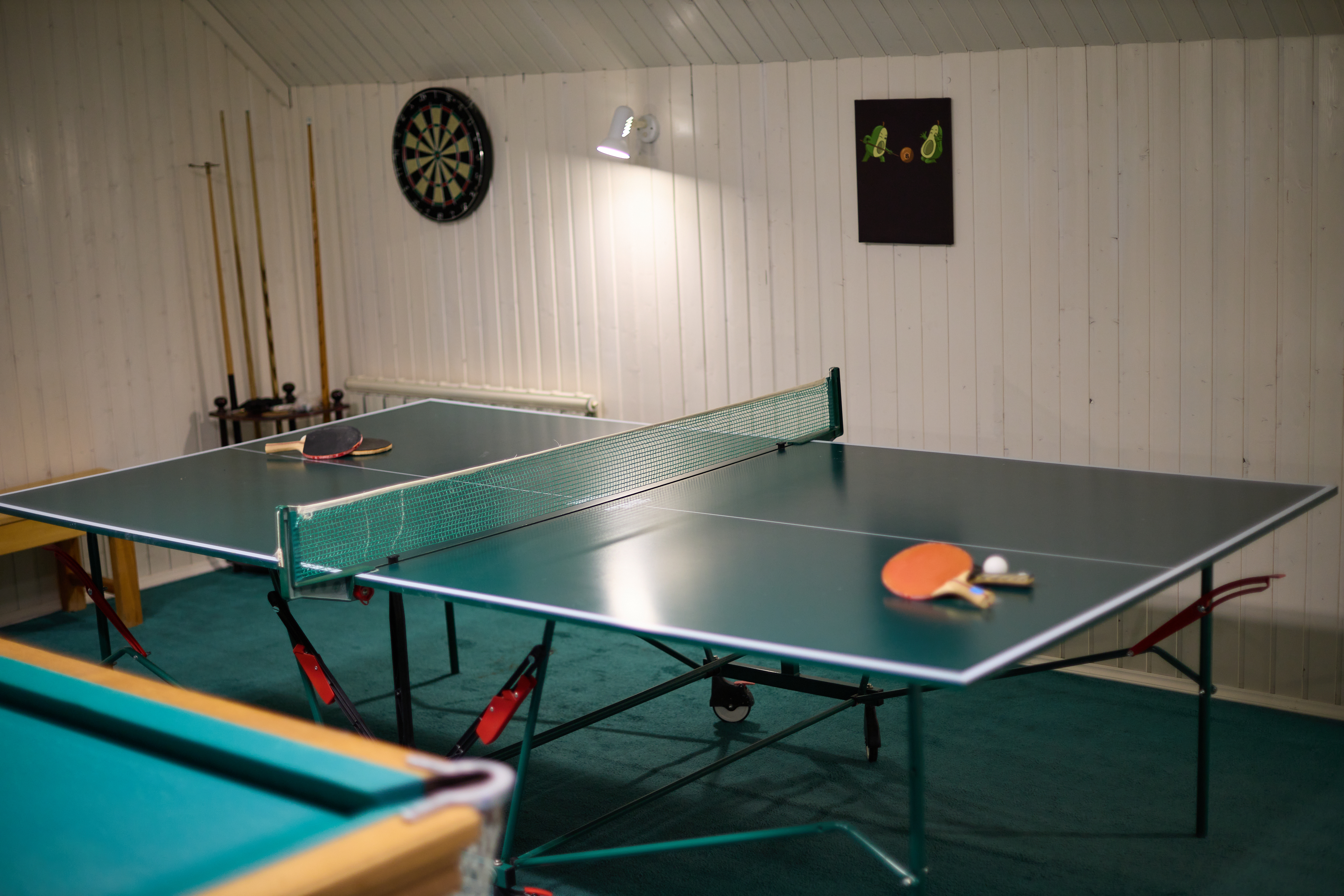 Игровая комната с бильярдом, настольным теннисом и футболом, дартс и куча детских игр.
